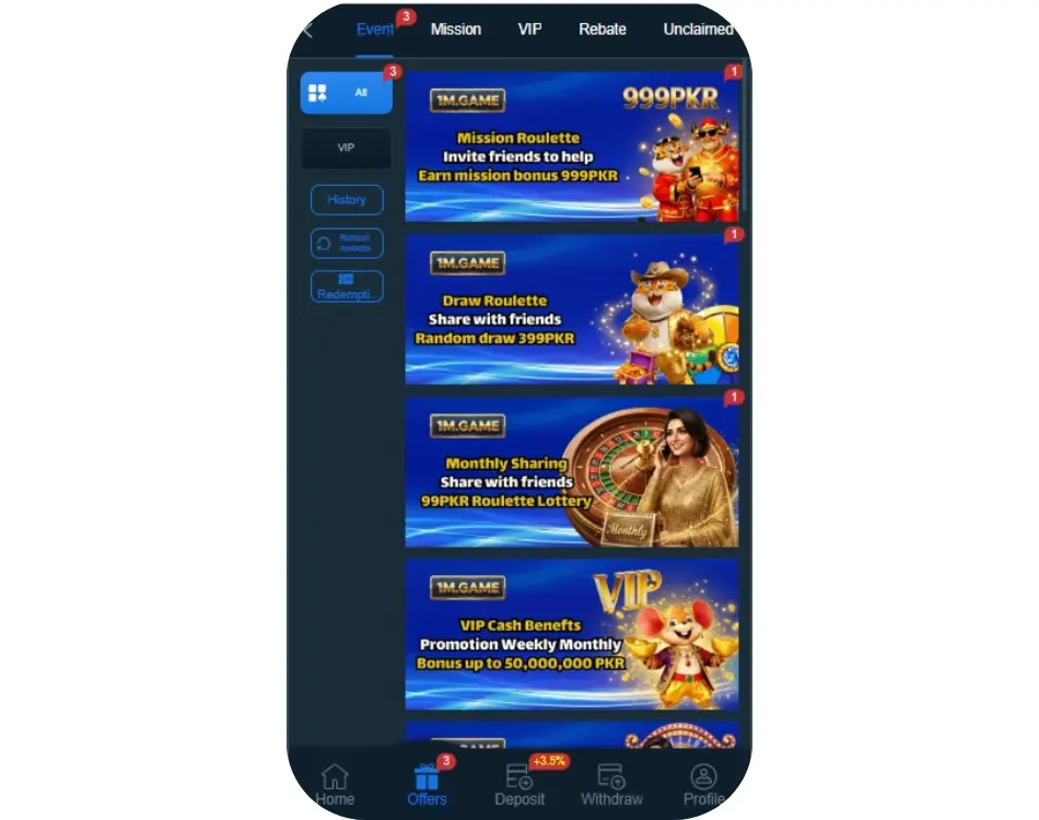 1M Game is the latest online gambling application designed for Pakistani users. Whether you are a real casino lover, this app has live betting. If you play a live betting game, then you feel that you are sitting in a real casino. This platform offers a referral program and multiple player modes.